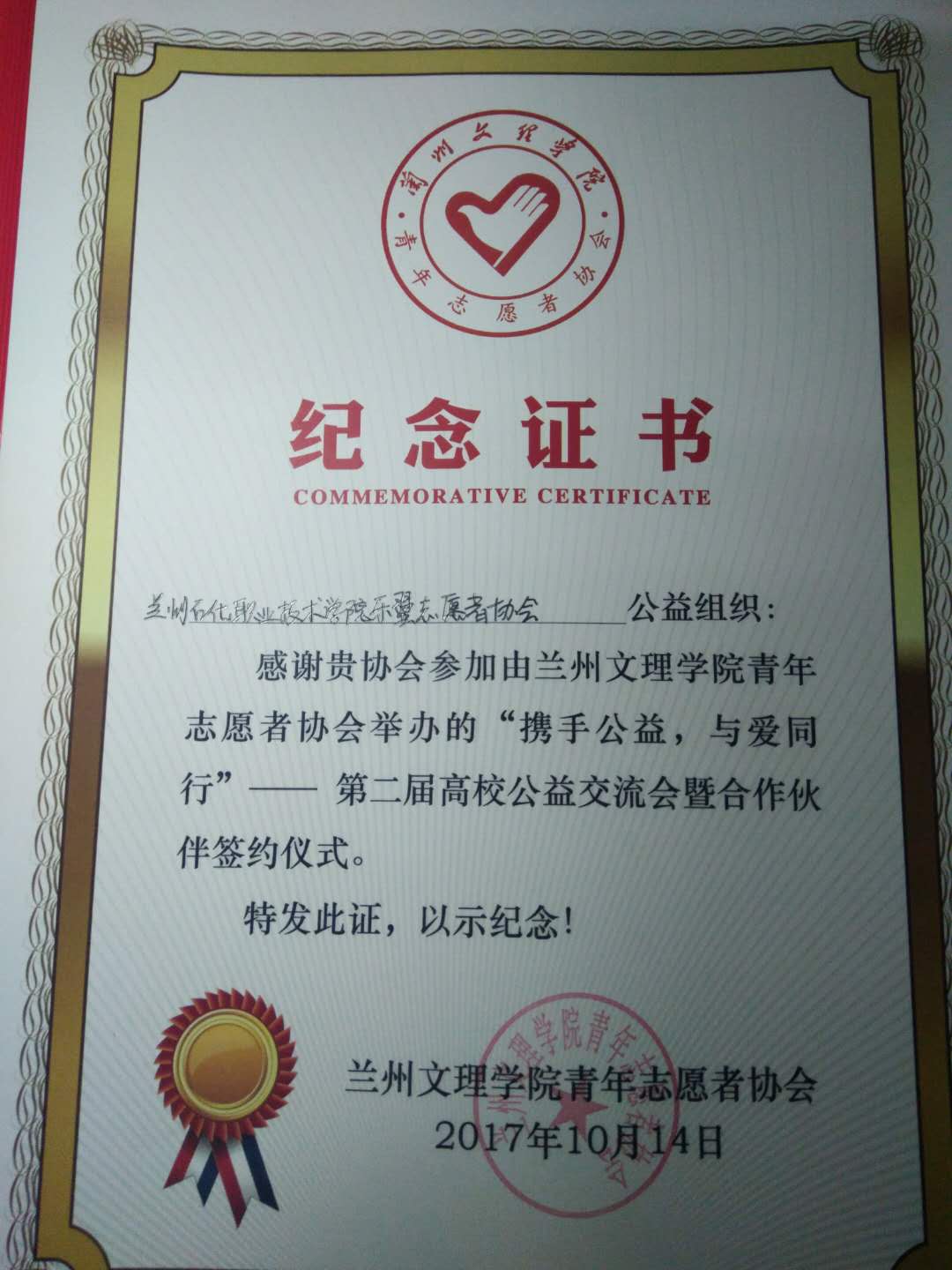 会后,兰州文理公司青年志愿者协会为兰州各大高校志愿者代表颁发了纪念证书和纪念品。