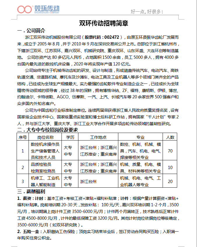 浙江双环传动机械股份有限公司(股票代码:002472)总部位于浙江杭州,下辖浙江台州、浙江嘉兴、江苏淮安、重庆南岸区、山东潍坊等制造基地。公司占地面积1500余亩,员工5000余人,拥有4000多台国内最先进的数控机床,2020年将实现年产值120亿元。公司一直专注于机械传动齿轮的研发、设计与制造,形成涵盖传统汽车、电动汽车、高铁轨道交通、非道路机械、摩托车及沙滩车、电动工具及工业机器人等多个领域门类齐全的产品结构,已经成为全球生产规模最大、实力最强的齿轮散件专业制造企业之一。 公司始终依托"专业化大生产"模式,本着"好一点,好很多"的经营理念,持续改善、锐意进取。在硬件设备上不断投入与升级,拥有全自动“滚-倒-剃”齿轮加工生产线,生产数控化覆盖率达到95%以上.