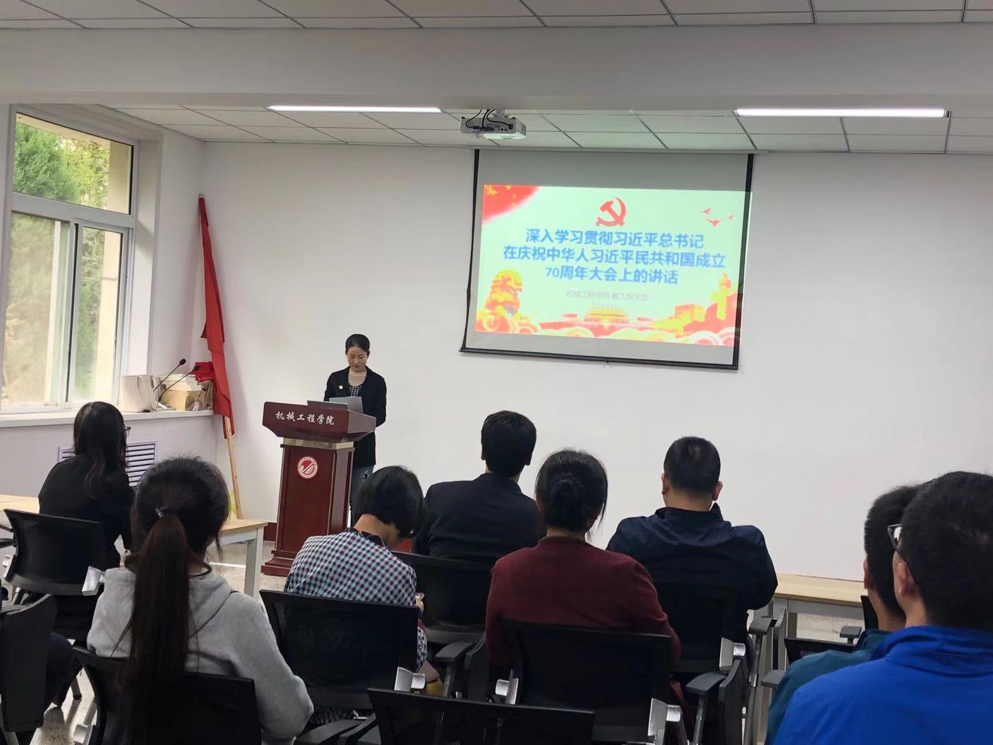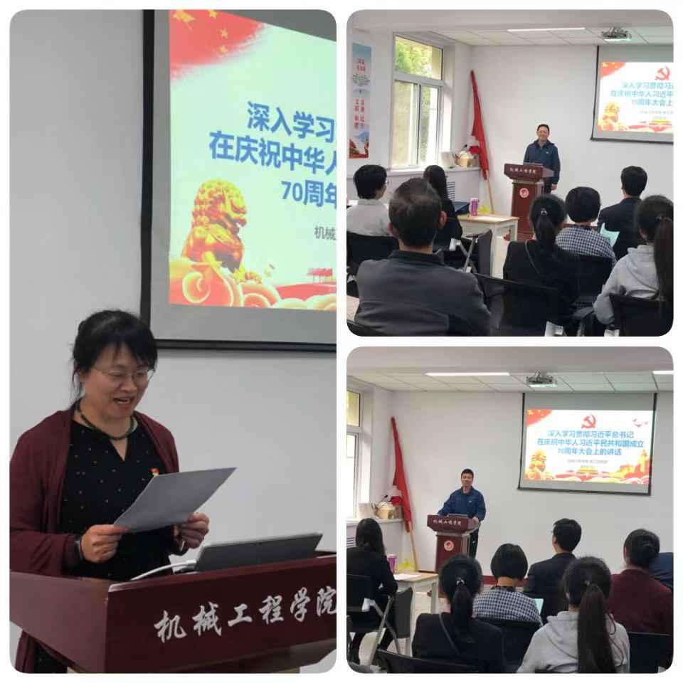 宣讲主题党课,深化认识理解。教工党支部书记张胜男领学了习近平总书记在庆祝中华人民共和国成立70周年大会上的重要讲话。总书记的重要讲话振奋人心,总结了新中国成立70年取得的伟大成就,明确指出在前进的征程上,要做到“五个坚持”,中国共产党始终不忘初心、牢记使命,团结带领全国各族人民,实现了从“站起来”、“富起来”到“强起来”的伟大飞跃,彰显了中国人民实现中国梦的雄心壮志。张胜男强调,我们要认真学习领会习近平总书记的重要讲话精神,坚持立德树人根本任务,努力为国家和社会培养一批批高素质技术技能人才。