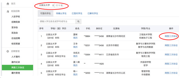 3.网签三方协议。进入“招聘管理—网签三方协议”管理页面,切换入驻的公司和毕业年份,点击“可签约员工”,找到目标员工,点击该生右侧操作栏的“网签三方协议”,按要求填写完整相关信息,保存后刷新,即可对该生发起邀约申请。如未找到目标员工,请线下联系就业负责人。