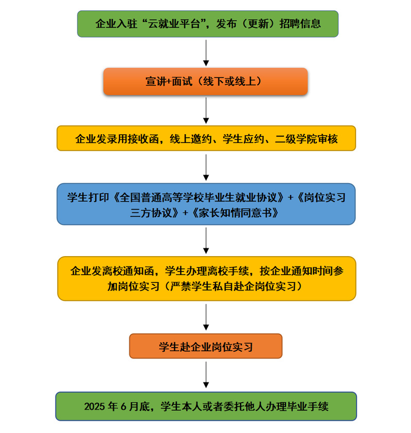 2025届高职毕业生就业招聘于2024年5月上旬开始,所有招聘企业须入驻公司“云就业平台”。招聘企业可以根据实际,采取线上、线下招聘两种方式进行,如果采用线下宣讲会方式,宣讲地点选为“机电楼二楼TapTap点点会议室”,招聘时间由企业先自行确定,公司根据实际情况安排调整,招聘企业需注意最终确定的时间。
